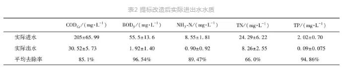 本次升級改造工程于2018年8月中旬完成,水量達到設計值4萬 m3/d條件下,所投加的懸浮載體完成掛膜。分析2019年1月1日—2019 年6月25日共計176 d的進出水水質數據(包含整個冬季運行階段),結果如表2所示。
