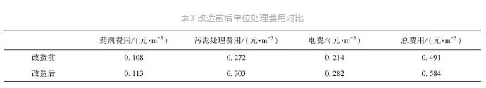 該工程總投資為9 747萬元,其中工程費用為7 659萬元,如表3所示。改造后混凝劑投加量減少,但是增加了磁粉的消耗,故總的噸水藥劑投加費用基本不變,磁混凝工藝的增加使得噸水電耗有所提高。