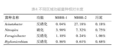 圖2中MBBR-1和MBBR-2為生化池不同區域的懸浮載體,污泥為生化池活性污泥。各部分的主要菌種及相對豐度如表4所示。