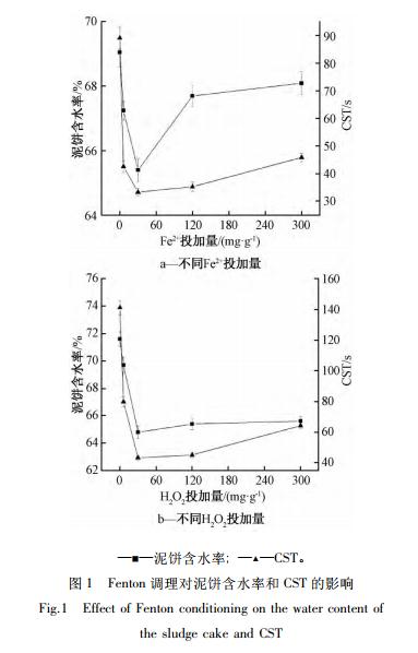 一般 認 為 Fenton 試劑氧化的最佳 pH 為 2 ~4,本實驗中調節污泥 pH 為 3。30%H2O2 投加量為 30. 0 mg /g 時,Fe2+投加量對污泥脫水性能的影響如圖 1a 所示。隨著 Fe2+投加量的增加,泥餅含水率和 CST 均先減小后增加,Fe2+ 投加量為 30. 0 mg /g時,泥餅含水率和 CST 達到最小值,分別為 65. 4%和33. 3 s。Fe2+離子在 Fenton 反應中作為催化劑促進·OH的產生,·OH 具有強氧化性,能夠破解污泥絮體、胞外聚合物( EPS) 和細胞的結構,氧化分解 EPS等有機物,促進細胞內部水和結合水的釋放,改善污泥脫水性能。同時,Fe2+被氧化生成的 Fe3+可以通過生成磷酸鐵沉淀及 Fe3+水解聚合沉淀產物進一步強化污泥脫水性能。