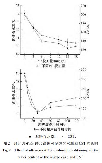 PFS 投加量為 15. 0 mg /g 時,超聲波作用時間對污泥脫水性能的影響如圖 2b 所示。泥餅含水率和CST 均在超聲波作用時間為 30 s 時達到最小值,分別為 70. 51%、123. 9 s。相關研究表明,超聲波的空化、水力剪切作用能破壞污泥菌膠團及細胞結構,釋放部分結合水,同時超聲波產生的局部發熱、界面破穩和振動作用都能加速固液分離,與 PFS 的聯用則進一步強化污泥沉降性能。但過長的超聲波作用時間可能會導致污泥顆粒被過度分解,污泥黏度增大,污泥脫水性能反而下降,不利于后續處理。