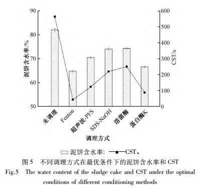 圖 5 對比了各調理方法在最優條件下所得污泥的泥餅含水率和 CST??芍? 各調理方法能不同程度地降低污泥的泥餅含水率和 CST,提高污泥的脫水性能。Fenton 調理的效果最為突出,泥餅含水率下降17. 26 百分點,CST 下降 520. 6 s,其次依次是蛋白酶K 調理、超聲波-PFS 聯合調理、SDS-NaOH 聯合調理和溶菌酶調理。其中,SDS-NaOH 聯合調理的最優pH 均為 3,NaOH 的協同作用反而使污泥脫水性能惡化。溶菌酶調理和蛋白酶 K 調理效果對比表明蛋白酶 K 更能促進污泥中水分的脫除,可能是由于蛋白酶 K 不僅能促進污泥中微生物細胞結構的水解,還能水解污泥中原有的和細胞破解后釋放的有機物質。